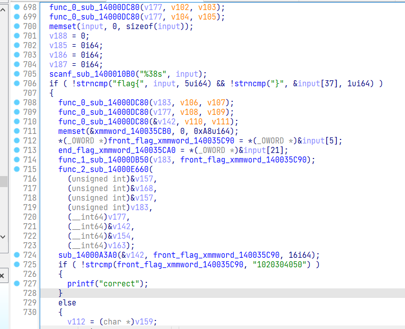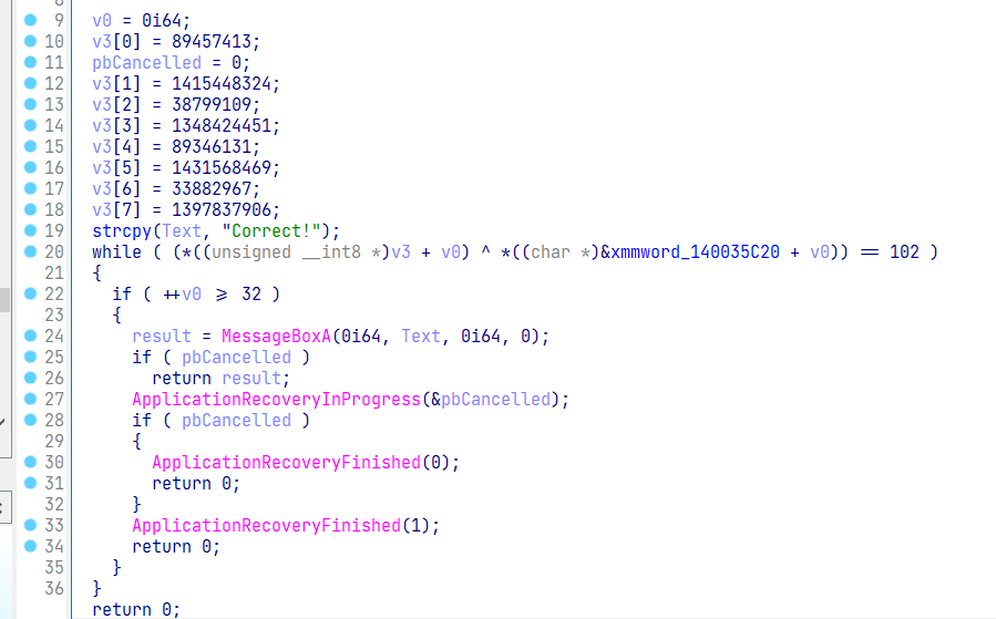 然后会发现这里会用MessageBox输出Correct!,这里的xmmword_140035C20会在一个函数赋值为flag{xxxxx..}中的xxxxx..,说明这里就是真实的check函数